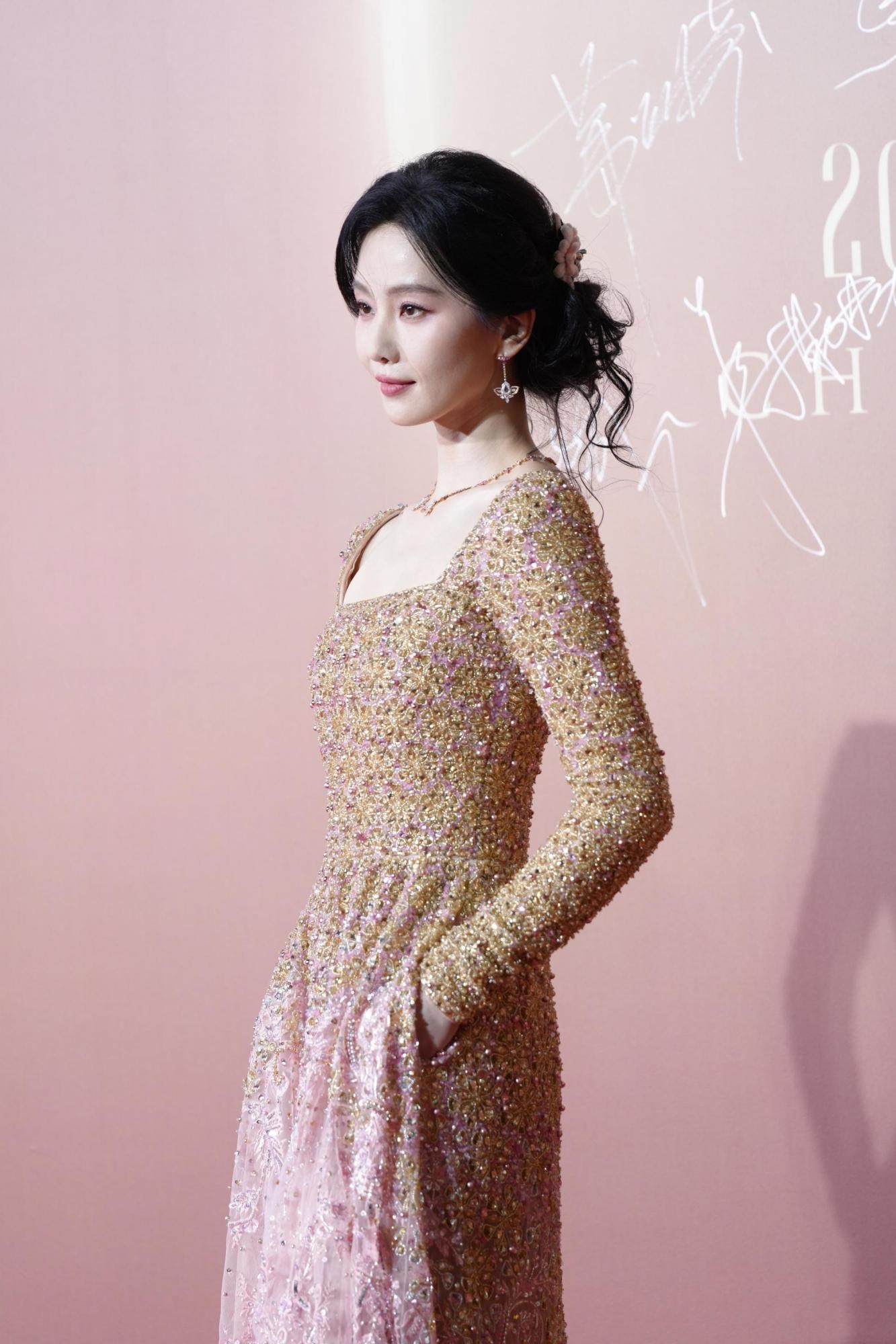 值得一提的是,这组照片的魅力很大程度上源于其“生图”属性。没有影棚里完美的灯光布景,也没有后期过度的肌肤磨皮,图片中皮肤的质感、礼服面料的光泽乃至现场的光影都显得无比真实。这种真实感非但没有折损她的美丽,反而让那份优雅变得更加可触可感。脸颊旁自然散落的几缕发丝,为整体端庄的造型注入了一丝随性与温柔,让人联想到她此前穿裸粉色礼裙时那种“大家闺秀温婉动人”的神韵。